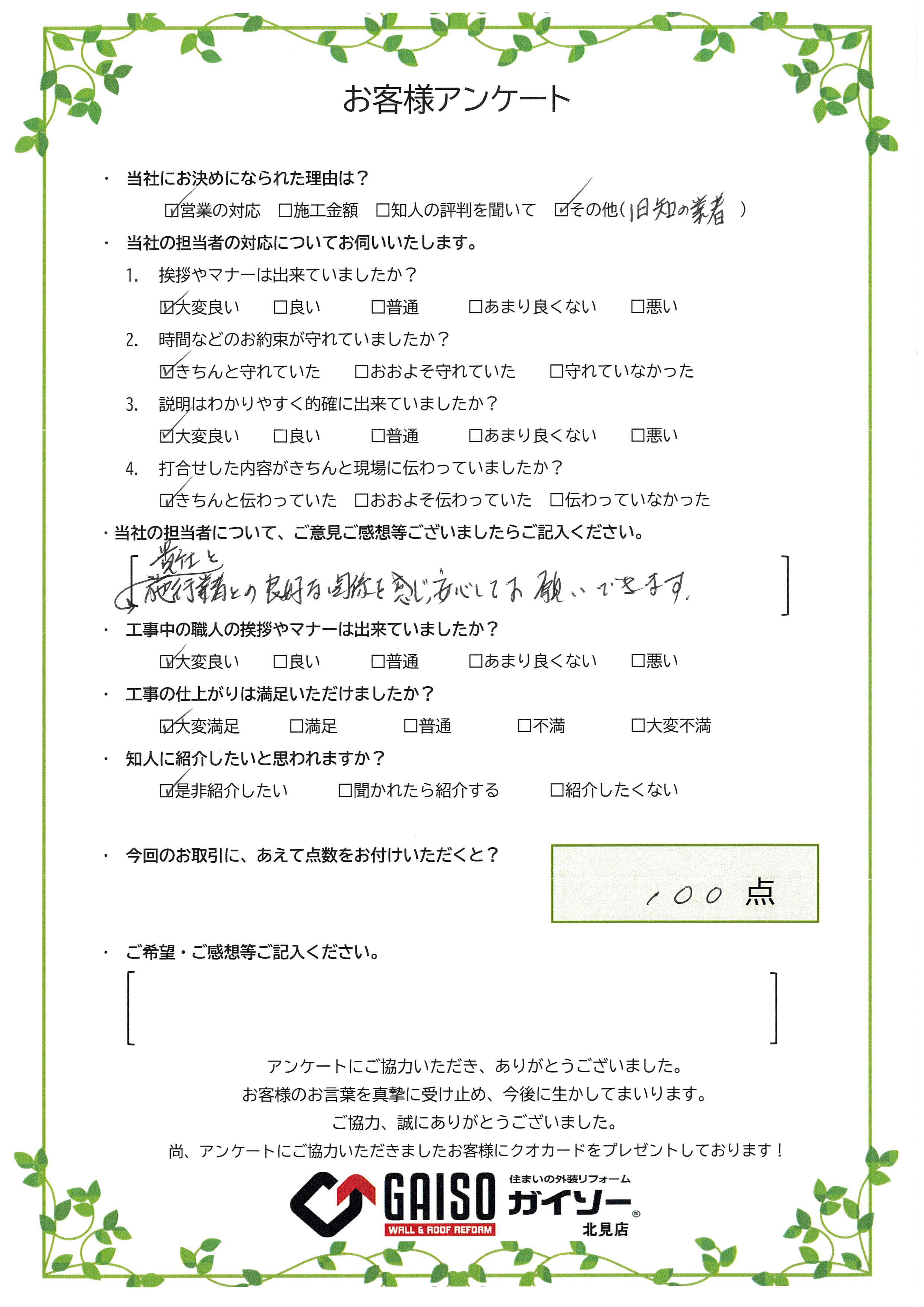 ・今回のお取引に、あえて点数をお付けいただくと?