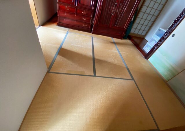 長年の使用による日焼けや傷みで畳が劣化しており、さらにタンスを置いていた部分は畳がへこんでいました。