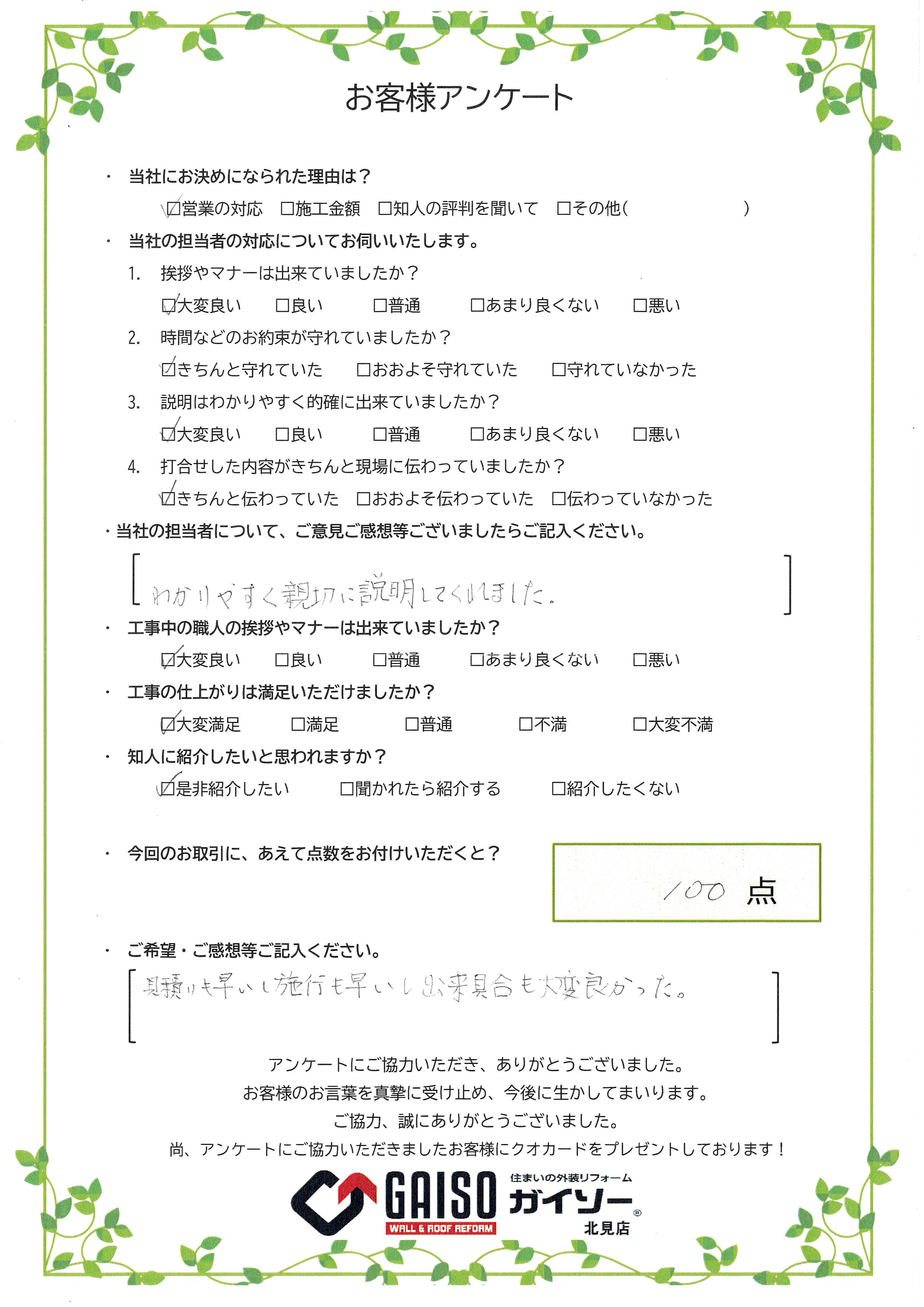 ・当社にお決めになられた理由は? ☐営業の対応 ☑施工金額 ☐知人の評判を聞いて ☐その他 ・当社の担当者の対応についてお伺いいたします。 1.挨拶やマナーは出来ていましたか? ☐大変…